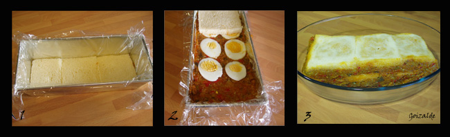 En la base del molde, poner 3 rebanadas de pan de molde, echar la mitad del pisto, colocar la mitad de las rodajas de huevo y tapar con otra capa de 3 rebanadas de pan de molde. Repetir la operación terminando con una capa de pan.