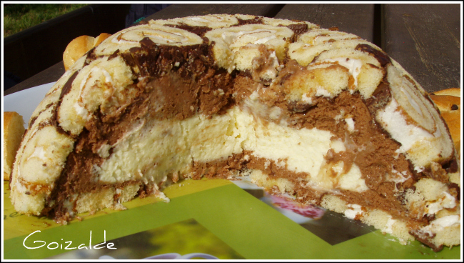 Me he lanzado a hacerla bicolor, porque era para el cumple de la peke y a ella lo que más le gusta es el chocolate blanco, pero me daba miedo que quedase muy empalagosa si la hacía solo con chocolate blanco, así que la rellené con mousses de 2 colores: de chocolate blanco en el centro y cubierto del de chocolate con leche.