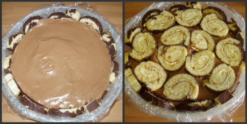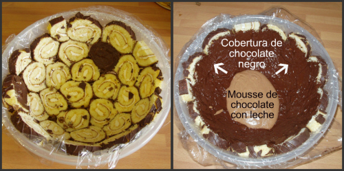 Lo rellenamos con el mousse de chocolate con leche restante y le ponemos más rodajas de brazo de gitano para que hagan de base al dar la vuelta.