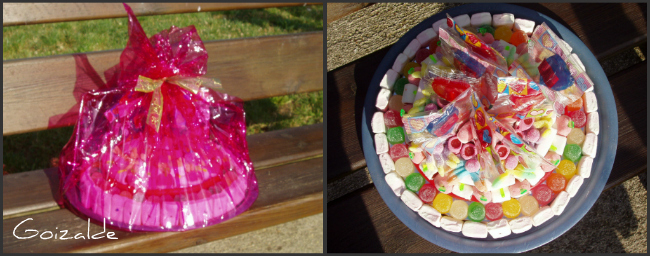 El año pasado por estas fechas hice una de estas tartas de chuches para mi sobrina, algo difrente, era una muñeca de chuches…. Jejejeje, no se si la habrás visto en algún foro, es una muñeca tipo Barbie y la falda (hasta los pies)se hace de corcho. ¡¡Quedó preciosa!! Y los críos (30) disfrutaron una cosa mala jajaja.