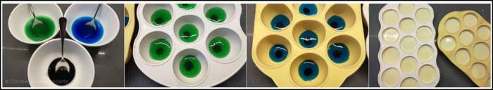 Con ayuda de una cucharilla verter el liquido verde en la mitad de los moldes y el azul en la otra mitad. Meter en la nevera alrededor de 1 hora.