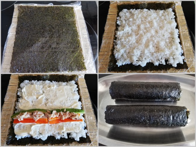 Colocar una lámina de alga nori sobre la esterilla de bambú, con las manos humedecidas en agua extender el arroz sobre el alga dejando un espacio de 2 cm sin rellenar en la parte más alejada a nosotros (es para que el alga se peque al hacer el rollo).