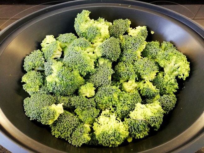 Verter 500 gr de agua en el vaso, trocear el brócoli y colocar en el varoma. Programar 25 min, varoma, vel 1. Reservar en el bol con la cebolla.