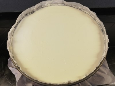 Verter esta crema sobre la base en el molde, alisar la superficie y reposar en nevera un mínimo de 4 hora, mejor toda la noche.