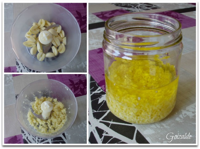 Ponemos el ajo picado en un bote de cristal o similar y lo cubrimos de aceite. Con esto conseguimos 2 cosas:
