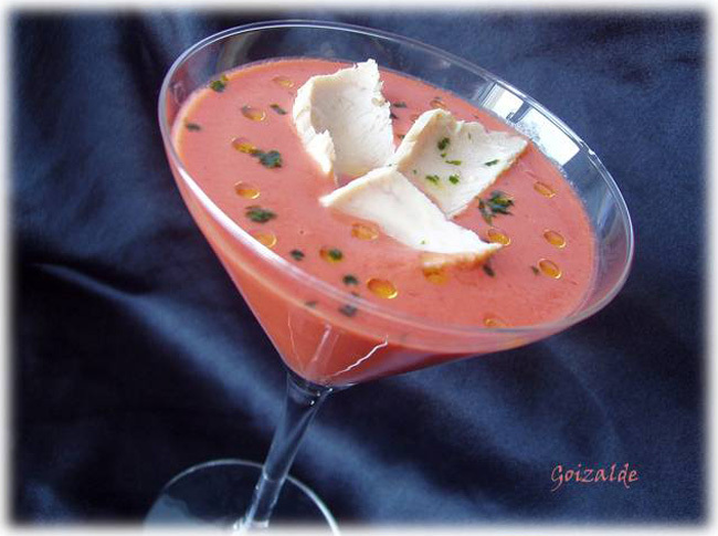 Servir acompañado con unas lascas de ventresca de bonito y decorado con un poco de perejil y unas gotas de aceite virgen extra.