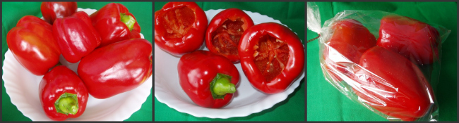 Meter los pimientos en las bolsas, hacer un pequeño agujero en la parte superior con un palillo y hornear 45 min a 190ºC. Bueno, ya se sabe que esto de los tiempos depende del tamaño, grosor, etc. Lo mejor es ir mirando como van.