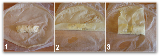 - Podemos poner la masa sobre la pasta brick y la enrollamos siguiendo los pasos de la foto de arriba: (1) colocar una croqueta sobre la pasta brick, (2) enrollar hasta la mitad, (3) volver las esquinas hacia el centro y terminar de enrollar.