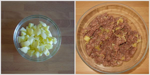 Mientras tanto salpimentar la carne, trocear la panceta y mezclar todo. Cuando acabe el tiempo echar esta carne al vaso y cocinar 10 min, 120ºC, vel 2 y giro a la izq (Tm 31: 12 min, varoma, vel 2 y giro a la izq).