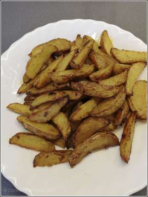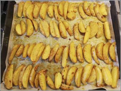 Colocar los gajos en una bandeja apta con papel de horno (para que no se peguen) y hornear unos 20 min. Sacar y dar la vuelta a las patatas y hornear otros 20 min.
