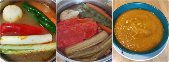 Cerrar la olla y cocinar unos 25-35 min desde que sale el vapor. El tiempo depende de la calidad de estas y de lo «viejas» o «nuevas» que sean las legumbres. Abrir la olla y sacar las hortalizas a un vaso batidor junto con algo del líquido de cocción, triturar bien y verter sobre las alubias. Dar un hervor al conjunto.