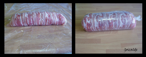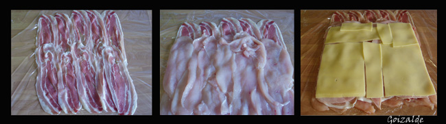 Poner 2 tiras de film (para conseguir mayor superficie) y sobre ellas colocar las tiras de bacon, y por capas ir colocando las pechugas, el jamón serrano, el york, el queso y las pasas. Tener la precaución de dejar en la parte opuesta a nosotros unos 6-10 cm de bacon sin poner nada más. Esto es para poder cerrar bien el rollo.