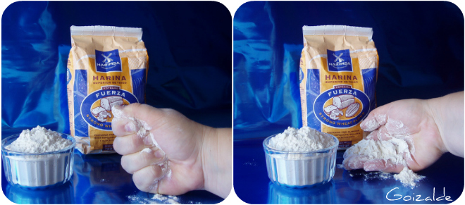 Para diferenciar una harina de otra un buen truco es: si coges un puñado de harina floja y aprietas (cierras) la mano, verás que se marcan las formas de los dedos, ya que gracias a la humedad mantiene la forma; sin embargo con la harina de fuerza esto no sucede, es tan seca que pierde la forma.