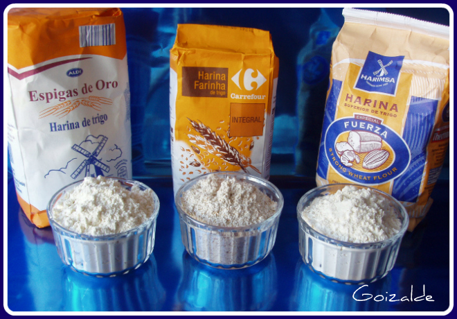 Estas harinas provienen de diferentes variedades de trigo. Si algún día en el super os encontráis que en el paquete de harina no pone si es de fuerza o no, mirad la etiqueta y si pone que contiene de un 13 a un 15% de proteína, eso significa que es harina de fuerza, porque tiene mucha cantidad de proteína (gluten). En cambio si pone de 5 a 12%, es floja, tiene poca proteína.