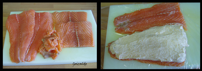 Poner en el vaso los recortes reservados, el salmón ahumado y la mantequilla, triturar 10 segundos en vel 6, bajar los restos de las paredes y repetir la operación. Añadir las especias, la sal y la nata y volver a triturar 10 seg, vel 6, bajar los restos y repetir la operación. Meter en manga pastelera. Si no se tiene manga pastelera, se puede introducir en una bolsa para congelar.
