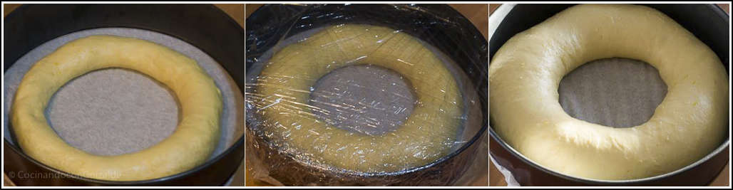 Untar un poco de aceite en una bandeja de horno, extender la masa con ayuda de un rodillo o con las manos, tapar con film y dejar levar unos 30-45 min.